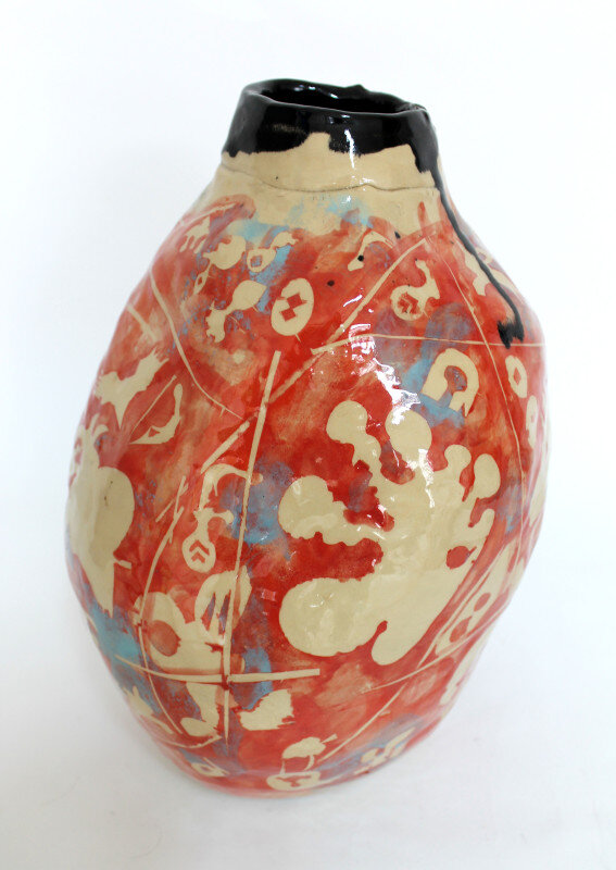 - Technik: Keramik: aufgebaut, Engobe- Reservage-Technik, glasiert